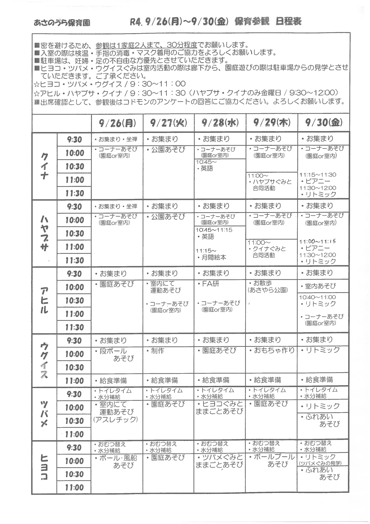R4年9月26日(月)~9月30日(金)は保育参観週間です!