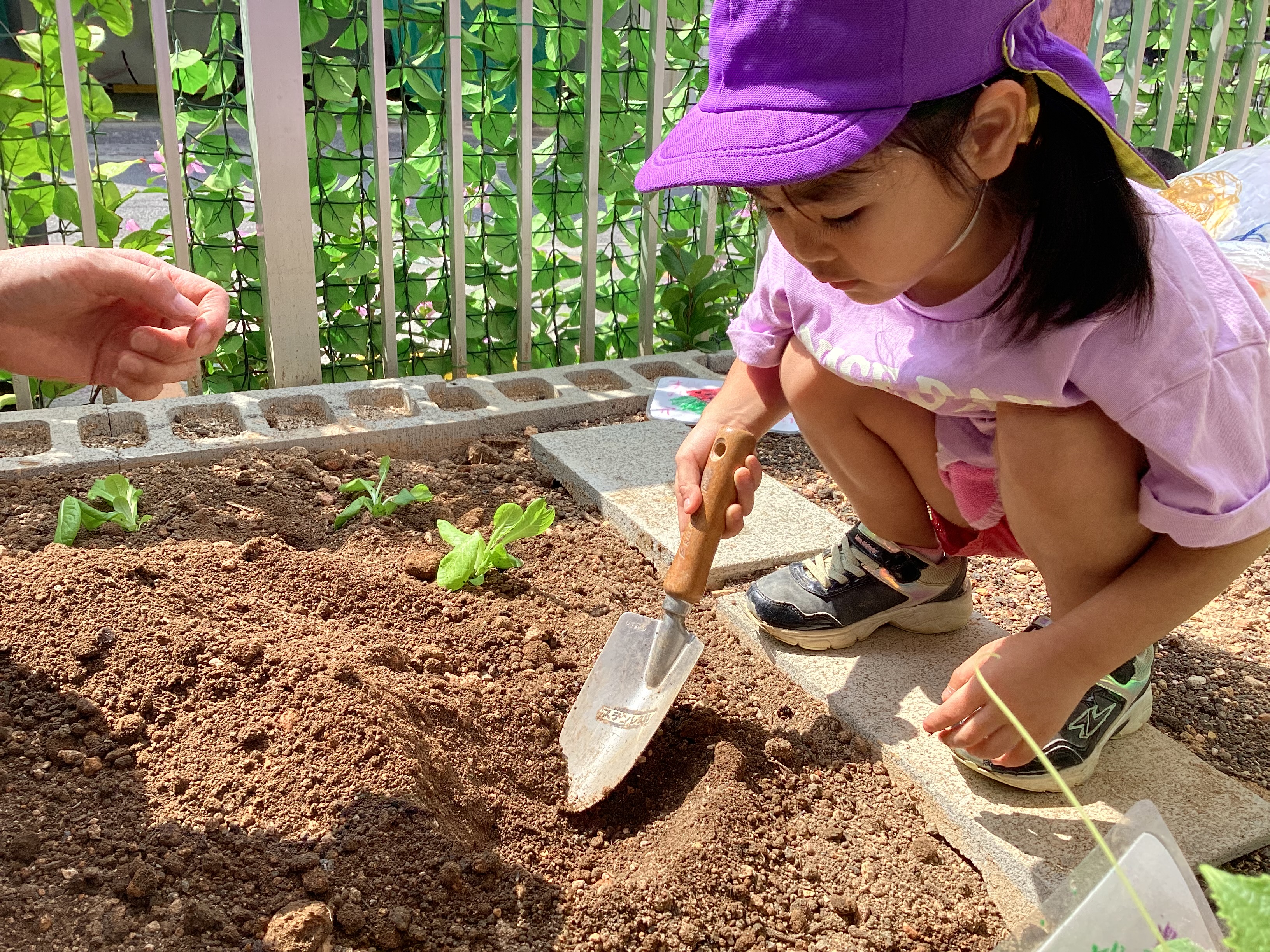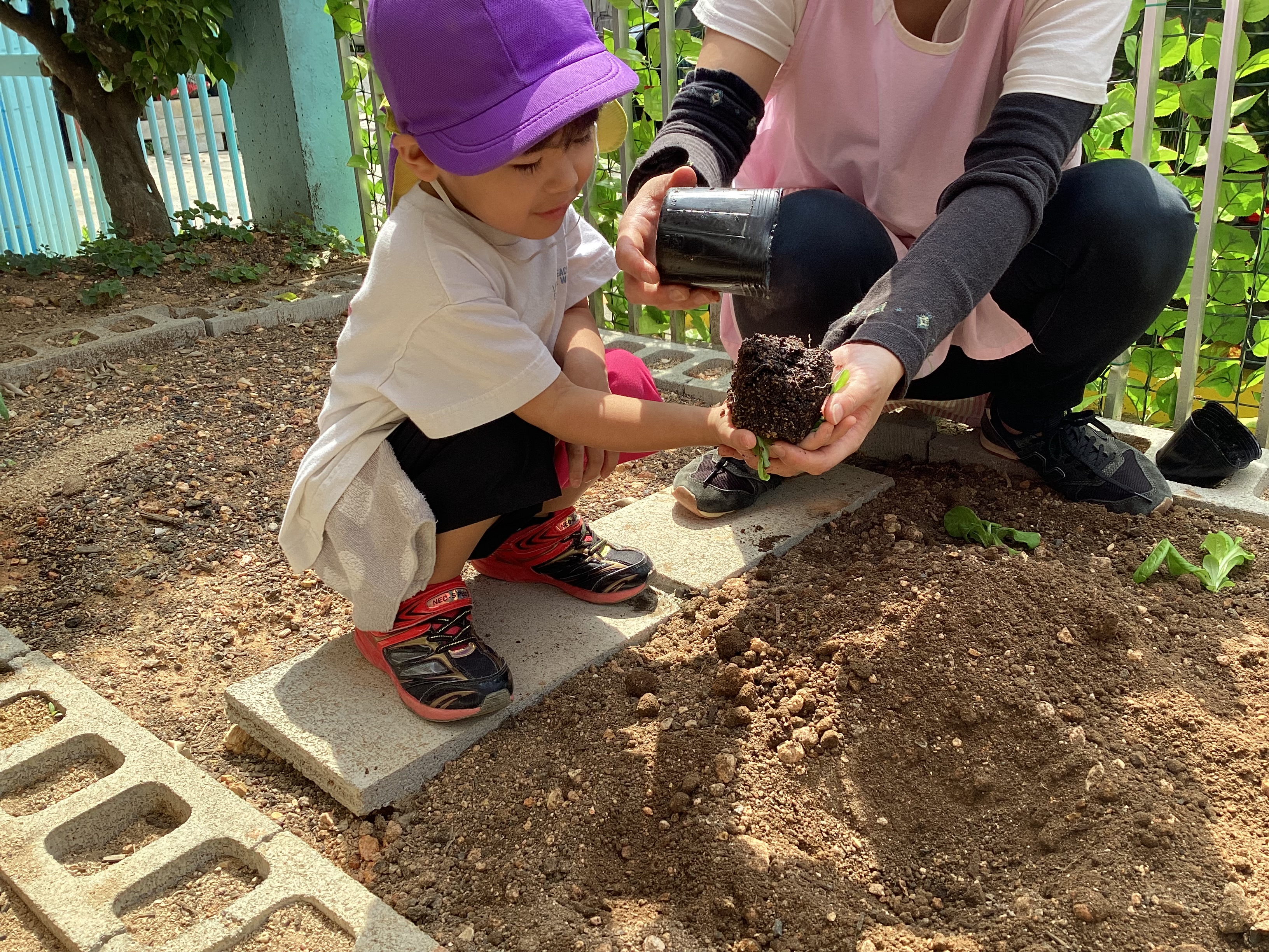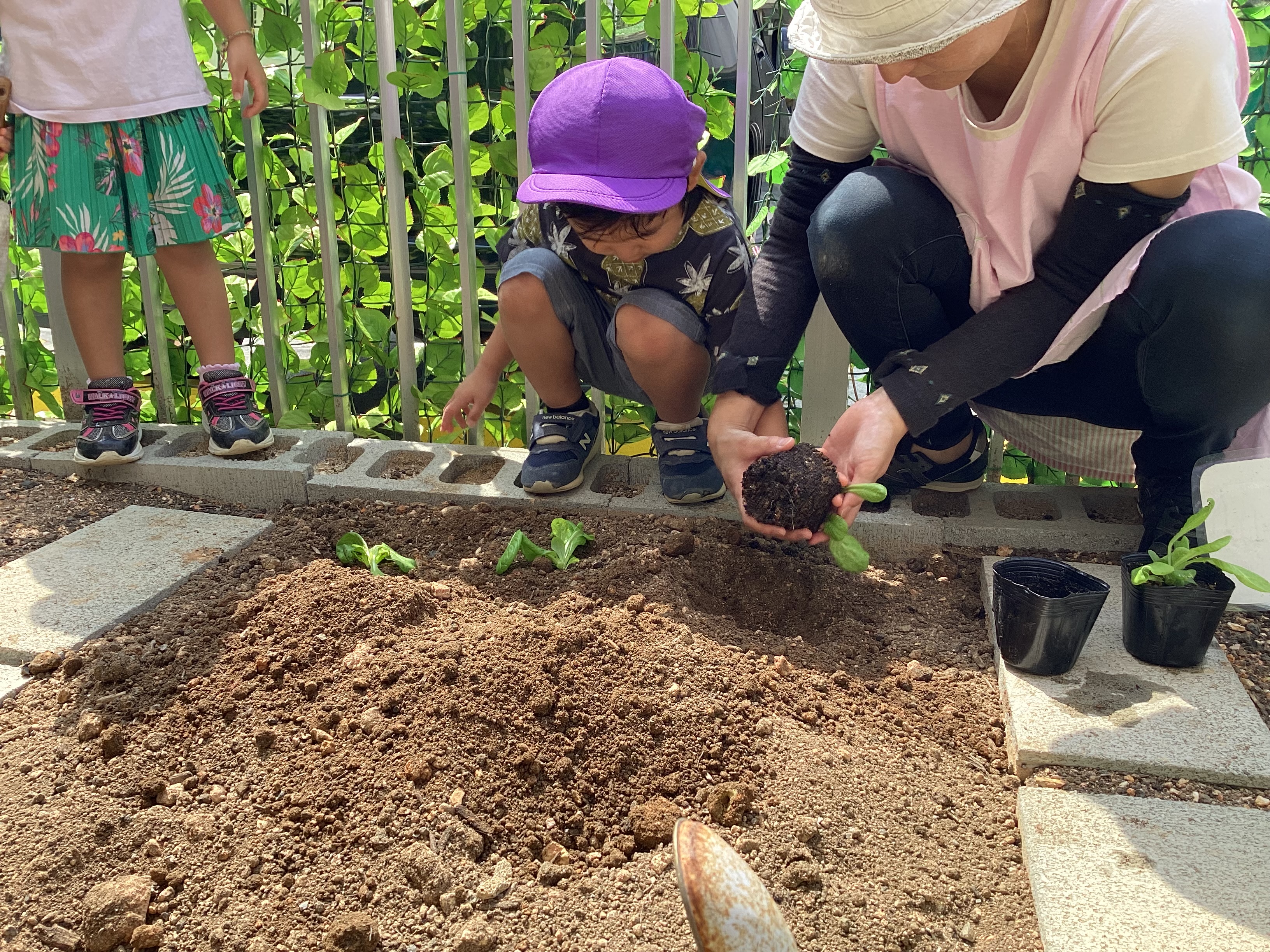 やさしく苗をもって植えていきました。